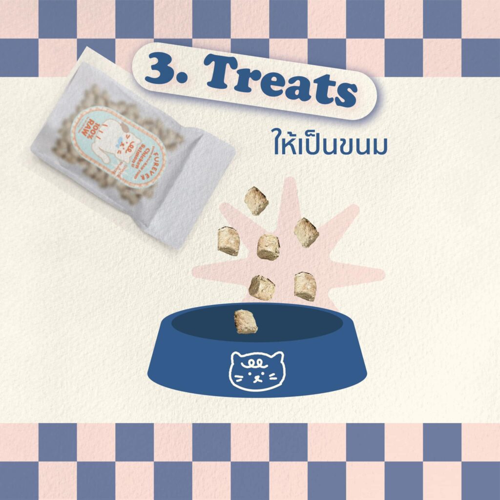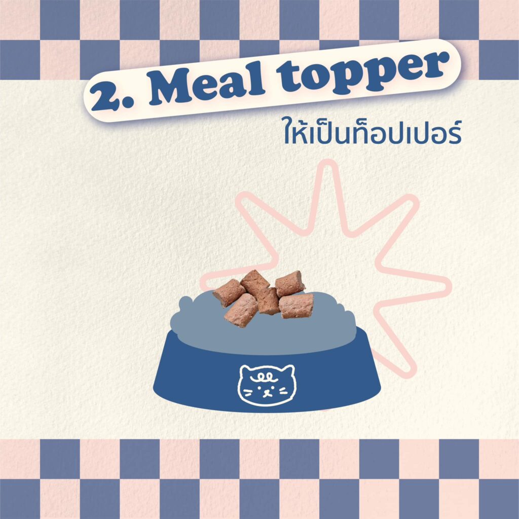 - โรยบนอาหารเม็ดปกติเพื่อเพิ่มรสชาติและกลิ่นหอม ทำให้แมวที่กินยากอยากกินมากขึ้น